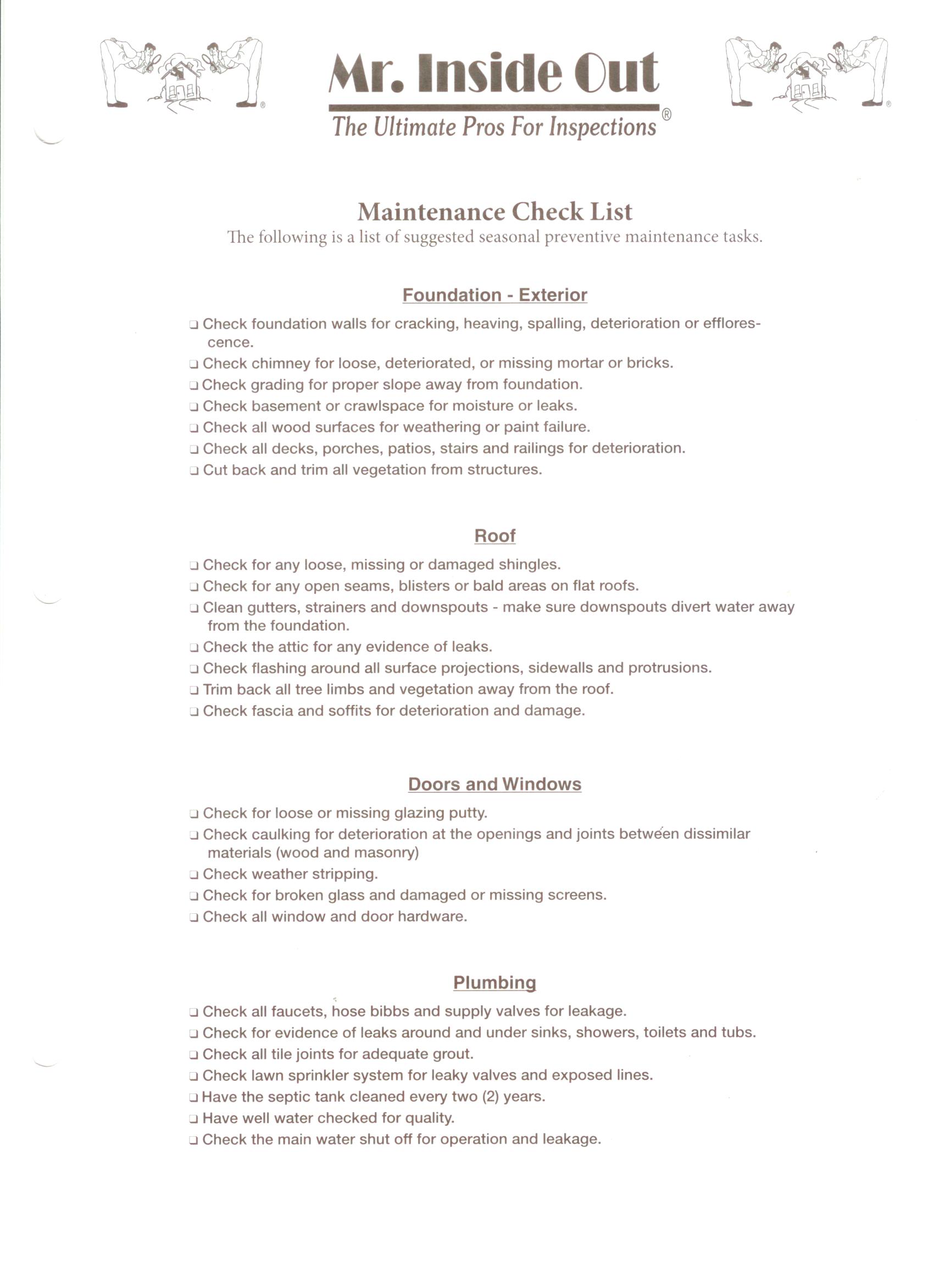 A number of maintenance improvements are relatively easy and inexpensive to make, yet they can substantially improve a home's appearance, efficiency, and comfort. A professional home inspector may make helpful maintenance suggestions, such as:
